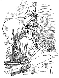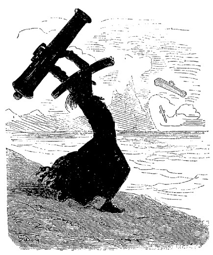 Je vis en outre dans ce pays quelques naturels de Sirius venus là pour affaires; ils ont des têtes de bouledogue et les yeux placés au bout du nez, ou plutôt à la partie inférieure de cet appendice. Ils sont privés de sourcils; mais lorsqu'ils veulent dormir, ils se couvrent les yeux avec leur langue; leur taille moyenne est de vingt pieds; celle des habitants de la lune n'est jamais au-dessous de trente-six pieds. Le nom que portent ces derniers est assez singulier; il peut se traduire par celui d'êtres vivants; on les appelle ainsi parce qu'ils préparent leurs mets sur le feu, tout comme nous. Du reste, ils ne consacrent guère de temps à leurs repas; ils ont sur le côté gauche un petit guichet qu'ils ouvrent et par lequel ils jettent la portion tout entière dans l'estomac; après quoi ils referment le guichet et recommencent l'opération au bout d'un mois, jour pour jour. Ils n'ont donc que douze repas par an, combinaison que tout individu sobre doit trouver bien supérieure à celles usitées chez nous.