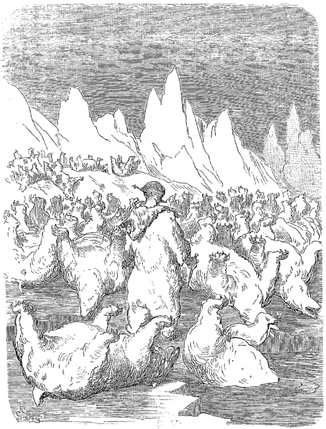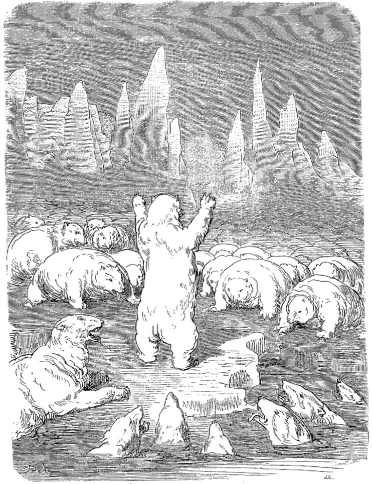 A environ un demi-mille en avant de nous flottait un immense glaçon, aussi haut pour le moins que notre grand mât, et sur lequel je vis deux ours blancs qui, autant que j'en pus juger, étaient engagés dans un duel acharné. Je saisis mon fusil et descendis sur la glace. Mais lorsque j'en eus atteint le sommet, je m'aperçus que le chemin que je suivais était extrêmement dangereux et difficile. Par moments j'étais obligé de sauter par-dessus d'effroyables précipices; dans d'autres endroits la glace était polie et glissante comme un miroir, de sorte que je ne faisais que tomber et me relever. Je parvins cependant à atteindre les ours, mais en même temps je reconnus qu'au lieu de se battre, ils étaient simplement en train de jouer ensemble.