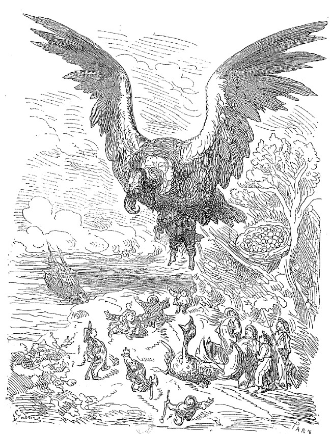 Nous remarquâmes entre autres un nid d'alcyons, dont la circonférence était cinq fois grande comme la coupole de Saint-Paul à Londres; il était artistement construit d'arbres gigantesques, et il contenait ...—attendez, que je me rappelle bien le chiffre!—il contenait cinq cents œufs dont le plus petit était au moins aussi gros qu'un muid. Nous ne pûmes pas voir les jeunes qui étaient dedans, mais nous les entendîmes siffler. Ayant ouvert à grand'peine un de ces œufs, nous en vîmes sortir un petit oiseau sans plumes, gros environ comme vingt de nos vautours. A peine avions-nous fait éclore le jeune oiseau que le vieux alcyon se jeta sur nous, saisit notre capitaine dans une de ses serres, l'enleva à la hauteur d une bonne lieue, le frappa violemment avec ses ailes et le laissa tomber dans la mer.