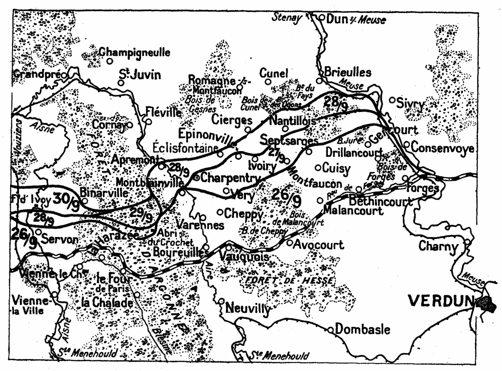 The German forces, following the retreat of the French Armies, slipped in on either side of the thick woods of the Argonne, along the Valleys of the Aisne and the Aire.
