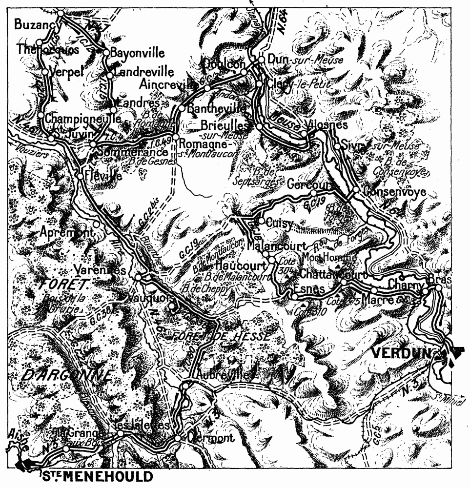 (1) The main road from Varennes to Vienne-le-Château, via the Four-de-Paris, where a road running north-south branches, crossing at Les Islettes, the “National Road,” and the railway from Châlons-sur-Marne to Verdun, via Sainte-Menehould.