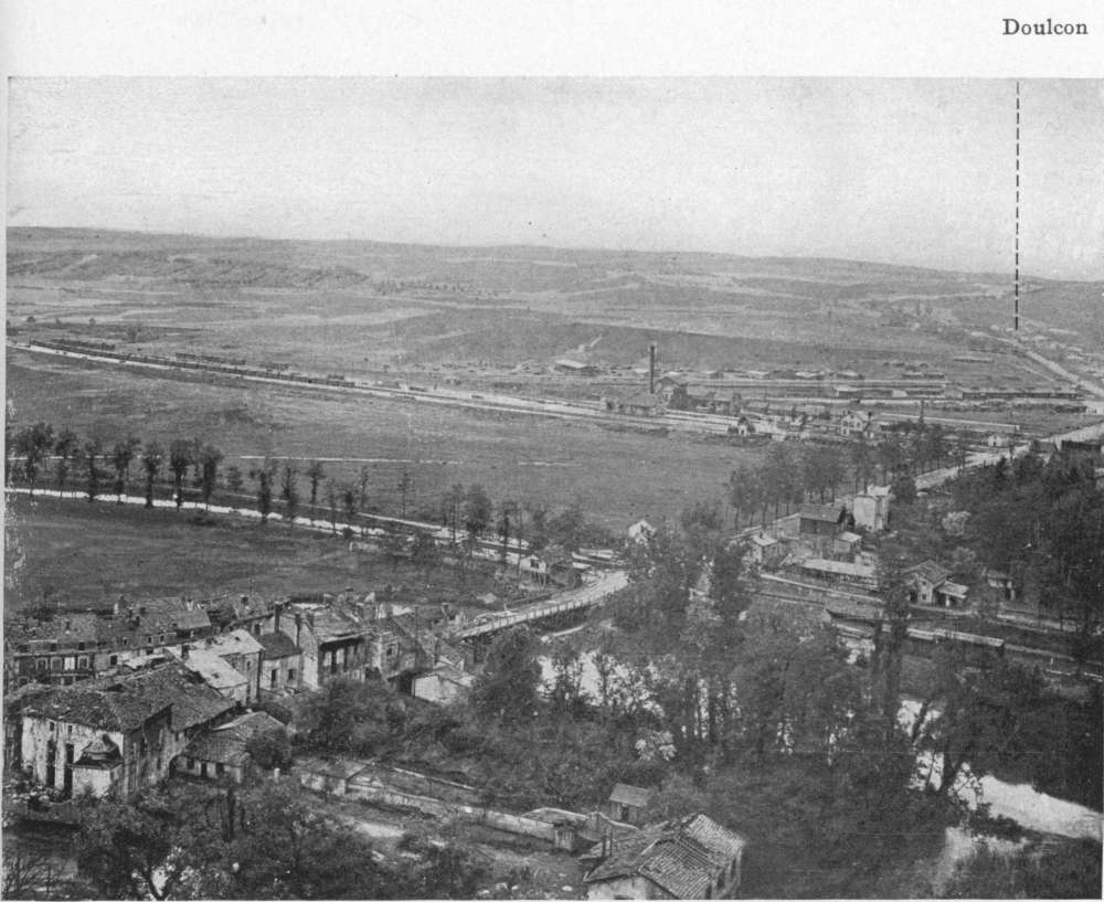 In January, 1915, the line crossed the Melzicourt Ford, a little upstream from Servon, and the Servon-Vienne-le-Château road to the north of Fontaine-la-Houyette, running thence, with numerous salients and re-entrants, through Gruerie Wood, as far as Fontaines-aux-Charmes and the outskirts of Bagatelle. From there it went south through Fontaine-Madame to within three-quarters of a mile north of La Harazée, then north towards St. Hubert, then south again, crossing the Meurissons Stream, to within 300 yards of Four-de-Paris, finally turning eastwards across the Woods of Bolante and Courte-Chausse, to the Valley of the Aire between Neuvilly and Boureuilles.