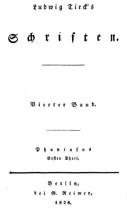 Von verschiedenen Seiten aufgefordert, war ich schon seit einiger Zeit entschlossen, meine jugendlichen Versuche, die sich zerstreut haben, zu sammeln, diejenigen hinzuzufügen, welche bis jezt noch ungedruckt waren, und andre zu vollenden und auszuarbeiten, die ich schon vor Jahren angefangen, oder entworfen hatte. Diese Mährchen, Schauspiele und Erzählungen, welche alle eine frühere Periode meines Lebens charakterisiren, vereinigt durch mannichfaltige Gespräche gleichgesinnter Freunde über Kunst und Literatur, machen den Inhalt dieses Buches. Manches, was ich in diesen Dialogen nur flüchtig berühren konnte, werde ich an andern Orten bestimmter darzustellen und auszuführen suchen. Diejenigen Dichtungen, welche schon bekannt gemacht waren, erscheinen hier mit Verbesserungen, und in der Summe der sieben verschiedenen Abtheilungen wird man eben so viele neue, als in den Volksmährchen, oder anderswo schon abgedruckte, antreffen. Die größeren Werke, wie der Zerbino oder die Genoveva schließen sich von dieser Sammlung aus.