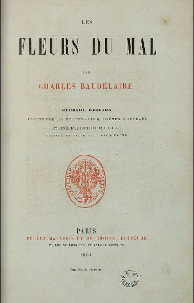 I am, fortunately, the possessor of a copy of the first edition of Les Fleurs du Mal. The title-page is as follows: LES FLEURS DU MAL || par Charles Baudelaire. || Paris: || Poulet-Malassis et de Broise: || Libraire-Éditeurs. || 4 rue de Buci. || 1857.