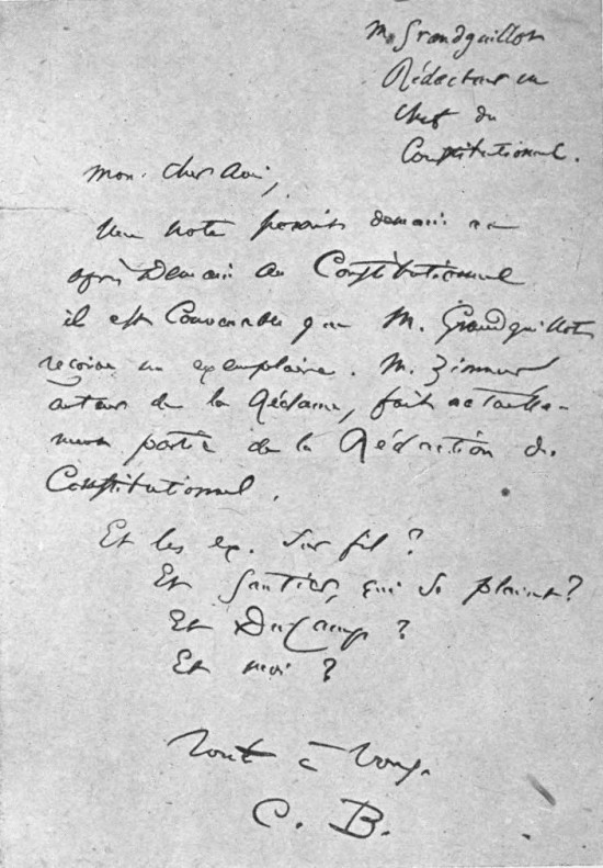| V. | Autograph Letter of Baudelaire to Monsieur de Broise, 1859. | |