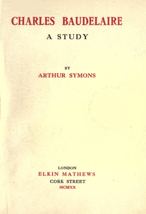 Poulet-Malassis came from Alençon to Paris, and began by printing the Odes Funambulesques of Théodore de Banville early in 1857, before he completed the publication of Les Fleurs du Mal in July of that year. Baudelaire wrote to him, saying that he did not want popularity, "mais un bel éreintage général qui attirera la curiosité." He asked him to be sparing in blank spaces on the pages; and to use certain archaisms and touches of red. These touches of red are given on the title-page; they have a decorative effect. He said that he had a natural horror of the over-use of inverted commas, which have a way of spoiling the text. He must have a unique system of his own. "I must have," he insists, "in this kind of production, the one admissible thing, that is, perfection." There one sees his unerring instinct; his sense of the exact value of words. Yet he writes to his publisher, underlining the phrase: "You know certain things better than I do, but whenever there is, on my part, no radical repulsion, follow your taste." He rages against de Broise's perpetual reproaches with regard to les surcharges de M. Baudelaire—the "author's corrections." He points out certain printer's mistakes, page 44 for page 45, and guères rhyming with vulgaire. There was no time to correct these errors; they remain so in the printed pages of my copy.