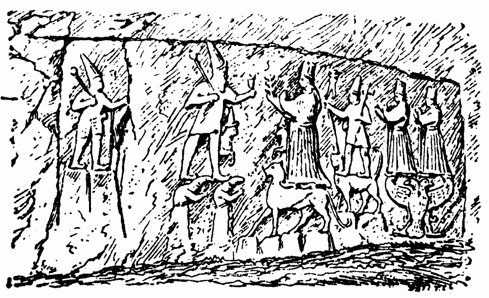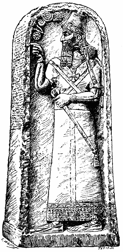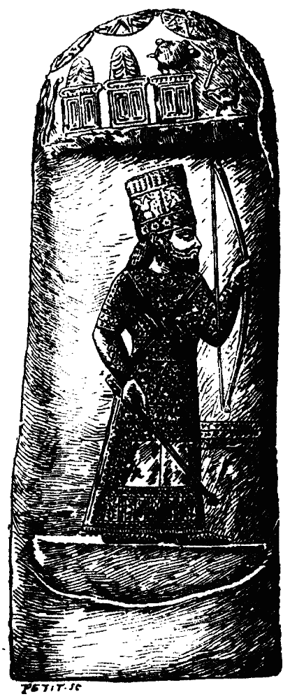 [68] There is some doubt whether this figure is Hittite at all. It may be of Babylonian origin. (See Perrot and Chipiez, Hist., t. iv., 550 f.) The boots are so slightly turned up at the points that they are more like those worn by Babylonian kings than the characteristic boots of the Hittites. The stela was brought from the castle of Birejik, not from the site of Carchemish, as M. Babelon states.