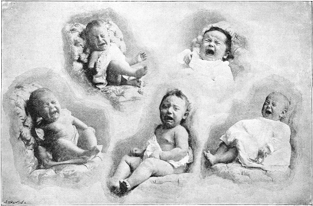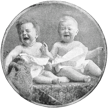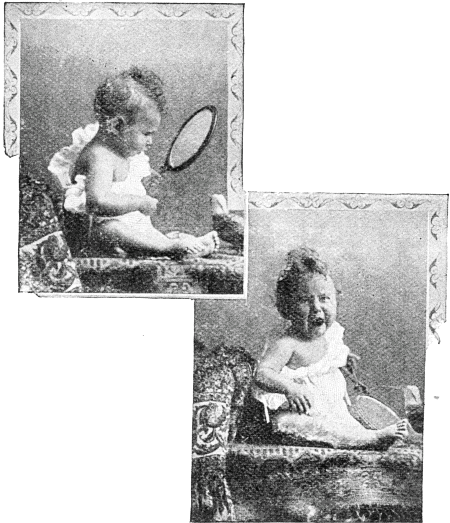 There is, too, the case of the little boy gazing so intently into a hand-glass; what did he find hidden in its depths to make him suddenly cast it aside, and turn to where the photographer is presumably standing, with such a look of mingled disappointment and disgust? His discovery was evidently remarkable, for, as will be seen, it had the additional effect of taking his fore-lock out of curl. Again Mr. Byrne is appealed to, and again he smiles and vouchsafes the same reply. And again the mothers of England will have their suspicions.
