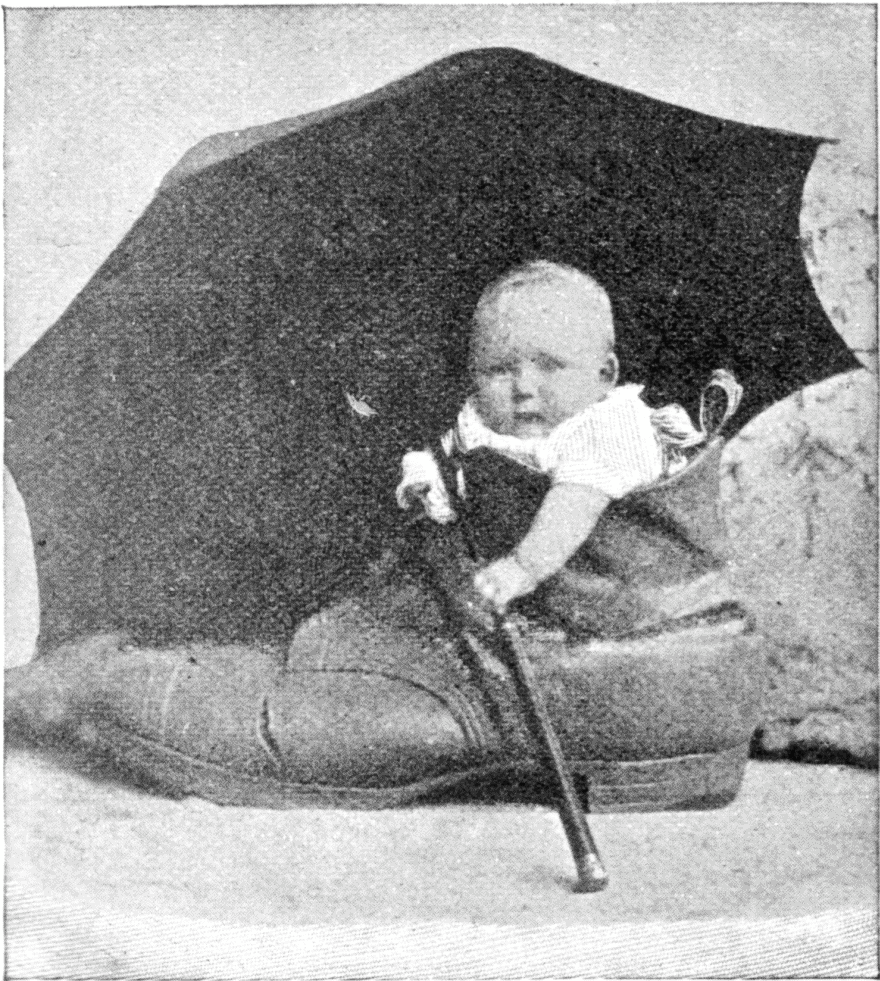 In photography, as in many another profession, the path of those who would forsake the beaten track does not lie through acacia groves. Many obstacles strew the way. For instance, Mr. Byrne conceived the notion of posing children in a big boot, such as appears in two of the accompanying reproductions. It is a simple-looking boot, yet it took two years to make; that is to say, the day the order was given, and the day it was satisfactorily carried out, were separated by a span of such duration. But much happened in between. First of all Mr. Byrne made a rough design of what he wanted, giving the dimensions, etc., and sent it, through a friend, to a local bootmaker. Perhaps, not anxious to have his idea noised throughout camera-land, Mr. Byrne's instructions were not as explicit as they might be; it was the time of the dynamitard outrages, and the worthy artist in leather grew suspicious. What might his customer want with such a boot? it was most unusual; he had never heard of a man with such a large foot; and why only one boot? He didn't like such peculiar orders, but he would do what he could in the matter; of course it would cost a goodish sum. As to whether the poor man had nightly visions of the strange boot being filled with infernal machines and placed under the [pg 102] House of Commons, and himself charged by the State with aiding and abetting the plot, no reliable information is forthcoming, but certainly, after two months had elapsed, he sent word to say that he found the work more difficult than he had anticipated, and that unless the one-legged individual, for whom the boot was apparently intended, could call and be measured in the ordinary way, he must regretfully throw up the job. A carpenter was next tried, but with little more success. The boot actually did come home, after a time, but it was large enough for six children to lose themselves in, instead of comfortably accommodating one. At this stage it occurred to Mr. Byrne that one of the Drury Lane "property" men, used to tailoring for pantomime giants and other unusual creatures, would be able to make a boot a little bit out of the common without being too inquisitive as to its mission in life. So it finally arrived, a beautiful creation, fit for any Brobdingnagian dandy, and redolent of Day and Martin. But Mr. Byrne wanted a dilapidated boot; to save further trouble, however, he proceeded, with the aid of a pocket knife and an old hatchet, to dilapidate it himself.