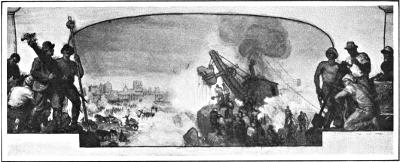 Before we come to the group of present workers in mural painting it is necessary that we consider an earlier man, again one of the pioneers, the artist William M. Hunt of Boston, who in 1878 obtained the commission to decorate the New York state capitol at Albany. The result was a fine series of pictures, well composed; but unfortunately they survive only in reproductions, the originals having been painted directly on the walls. These, owing to faulty construction, did not long remain intact, falling out of plumb, and they had to be supported by beams until they were finally entirely destroyed. Hunt had been a pupil of Thomas Couture (koo-toor´) in Paris, a man who had strong influence on his work, and these decorations were very reminiscent of his master. The pictures were fifteen by forty-five feet in size, and the themes were “The Flight of Night” and “The Discoverer,” of which only photographs remain to tell the tale.