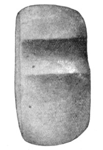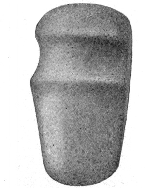 In the second class the groove is formed by pecking into the body of the ax after the latter is dressed into shape; in this pattern a regular continuous line from edge to poll would touch only the margins of the groove, leaving it beneath. An apparent medium between the two is sometimes seen, in which there is a projection on the lower side of the groove only; this is due, usually, to dressing the blade down thinner after the implement was originally worked to a symmetric outline. By continuous or long use the edge of the ax becomes broken or blunted and requires sharpening, and in order to keep the proper outline to make the tool efficient, it is necessary to work the blade thinner as it becomes shorter. No such change is required in the poll, consequently a projection is formed where originally there was no trace of one.