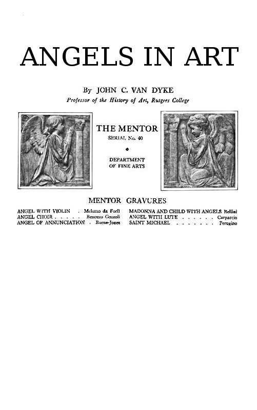The early men—the Fra Angelicos, the Benozzos (ben-ots-o), the Filippinos, of the fifteenth century—believed in the Biblical scenes they painted, and sometimes stated their belief in letters of gold at the bottom of their pictures. They saw things with the eye of faith,—saw Madonnas, saints, and angels in visions, and painted them, as the evangelists wrote, by the aid of inspiration. Perhaps it was their belief, their intense feeling, that gave the fine religious sentiment to the work of these early men. Yet they did not invent or discover the angel in art. It had a more mate[2]rial and commonplace origin than in medieval belief and religious fervor.