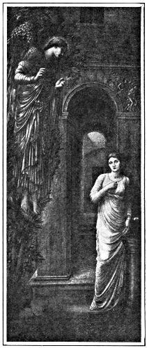 The Burne-Jones type had rounder, more inquiring eyes, thinner cheeks, a sadder mouth, a more willowy figure. It appears often in long, flowing hair, with swirling drapery, and dramatic action. At other times one sees it as a romantic type consumed by a fever of passionate sentiment. The Annunciation shown herewith is not a very good illustration of this. The Madonna has a dull stare in her eyes as though she was something of an invalid, and even the angel has a semi-malarious look. But the melancholy, the sadness, the morbidity, so apparent in Botticelli are also apparent here. The picture is a fine example of the painter's decorative sense. It has been put together with much skill. Notice the architecture, the passageway at back, the bas reliefs, the repeated lines of the draperies in both the Madonna and the angel. One could almost wish it in stained glass, so beautifully would it fill an upright window.
