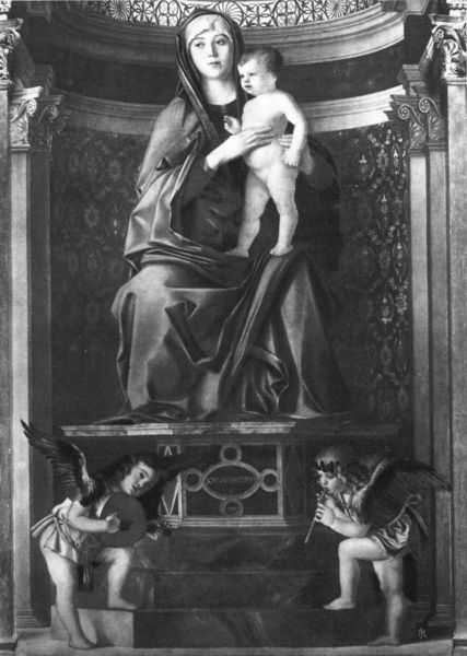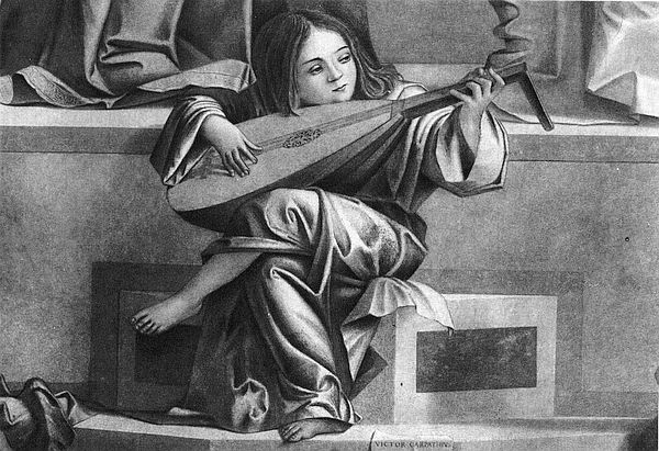 Frequently the Cherubs are given enlarged childlike or feminine forms with individual features, elongated wings, variegated colors. They are then shown hovering or standing or seated near the Madonna, and are usually playing on musical instruments—making music for the glory of the Madonna and Child. They are seen in the pictures of Bellini (bel-lee´-nee) and Carpaccio (kahr-pah´-cho) near the foot of the throne; with Melozzo da Forlì (for-lee´) they soar in the air; with Duccio (doo´-cho) and Cimabue (chee-mah-boo´-ah) they stand about the throne, dressed in rich robes, singing, playing, or worshiping. Music and color were associated in the minds of the early Italians as though both were manifestations of sentiment in art. Especially was this true at Venice,—the one great color spot in Italian art.