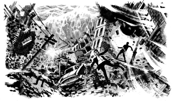 Despite hopeful announcements that the wave was slowing, had virtually stopped after inundating Oklahoma City, was being swallowed up in the desert near Amarillo, the wall of water continued its advance. For the land was still sinking, and the floods were constantly replenished from the Gulf. Schwartzberg and his geologists advised the utmost haste in evacuating the entire area between Colorado and Missouri, from Texas to North Dakota.