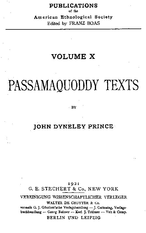 There is also a large amount of oral literature handed down by these Indians, a quantity of which existed in the manuscripts of the late Hon. Lewis Mitchell, former Indian member of the Maine Legislature. These documents, together with Mitchell's version of the Wampum Records, came into my possession some years ago, but were all destroyed by fire in 1911, since which time Mr. Mitchell industriously reproduced them at my request from memory. They are herein presented to Americanists for the first time in the original in Series 2, 3 and 4 of the following texts. Other matter of this character has already appeared in the Philosophical Society's Proceedings, XXXVIII, pp. 181-189: "Some Passamaquoddy Witchcraft Tales;" American Anthropologist (N. S.), XI, No. 4, pp. 628-650: "A Passamaquoddy Aviator."