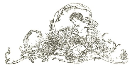 [Pg 98]She dreamed that she was walking alongside an endless canal, the banks of which were bordered with tall orange-trees and myrtles in flower. There, as she wandered disconsolately lamenting her fate, of a sudden a young Prince stood before her. He was handsome as the God of Love in picture-books, and when he spoke it was with a voice that went straight to her heart. 'Dear Beauty,' he said, 'you are not so unfortunate as you suppose. It is here you shall find the reward of your goodness, denied to you elsewhere. Use your wits to find me out under the disguise which hides me—that is, if as I stand here now you find me not altogether contemptible. For I love you tenderly—you alone—and in making me happy you can attain to your own happiness. Beloved, never distrust your own true heart, and it shall lead you where the heart has nothing left to desire!' So saying, the charming apparition knelt at her feet, and again besought her to accept his devotion and become mistress over all his life.