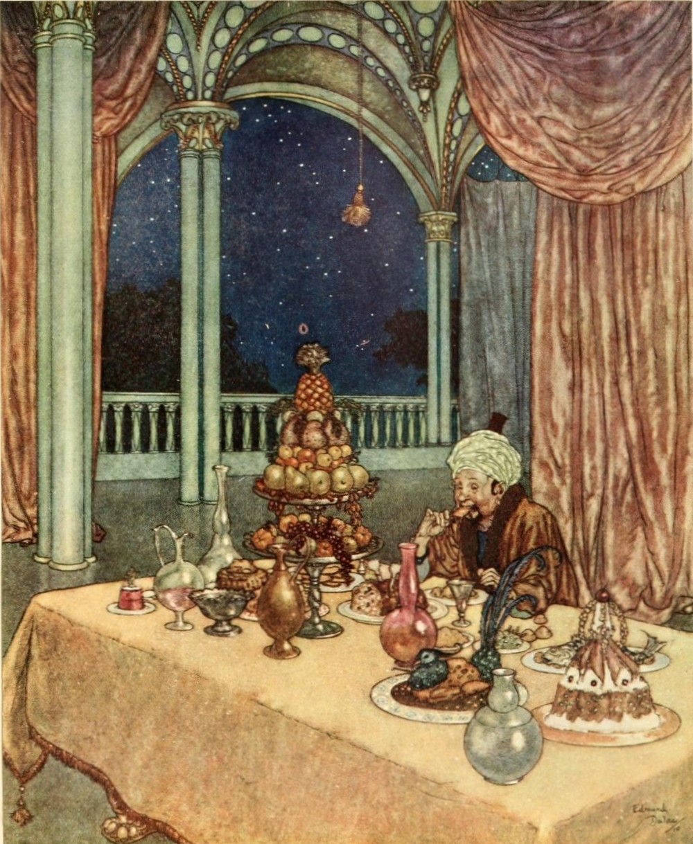 So they did this and went back to the little room, where to their amazement they found a breakfast laid on the table. For a moment they could scarcely believe that the night had flown by whilst they were occupied in ransacking the treasure chamber and packing the trunks. But, glancing at the windows, they saw that day was indeed breaking; and presently a bell sounded, warning the merchant to eat quickly and depart.