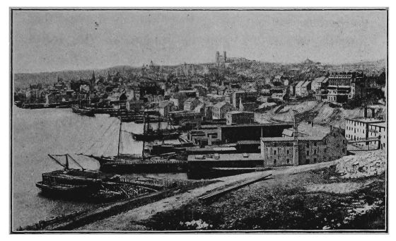 The approach to St. John's is romantic. The barrier of cliffs still rises to larboard, without an apparent break or indentation, whilst they say that we shall be anchored at the wharf in ten minutes. Another scanning of the coast reveals at length two rocks rising higher than the others, with a slight fall between them. The ship ploughs[3] along broadside, and until exactly opposite this opening. With a few final plungings, and last rollings and tossings, she is brought sharply round, and we face the harbour of St. John's. The great brown rocks, sparsely sprinkled with green, rise up forbidding our entrance, and inside these is another amphitheatre of granite against which the town of St. John's is built. The line of wharves forms a black foundation. The haven where we would be lies peaceful and blue in the midst. The first sight of St. John's and the last, always include the twin red towers of the Roman Catholic Cathedral standing out on a platform above the town.