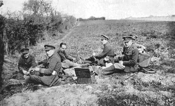 I was attached, with my car, to the Headquarters Staff of the 1st Cavalry Division, Major-General H. de B. de Lisle, C.B., D.S.O., commanding. The Echelon A Divisional Staff Mess consisted of General de Lisle; Colonel "Sally" Home, 11th Hussars, G.S.O. 1; Major Percy Hambro, 15th Hussars, G.S.O. 2; Captain Cecil Howard, 16th Lancers, G.S.O. 3; Major Wilfred Jelf, R.H.A., Divisional Artillery Commander; Captain "Mouse" Tomkinson, "Royals," A.P.M.; Captain Hardress Lloyd,[2] 4th Dragoon Guards, A.D.C.; Lieutenant "Pat" Armstrong, 10th Hussars, A.D.C., and myself.