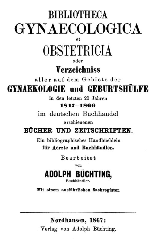 Da es nun aber sehr, sehr viele Aerzte giebt, die ein specielles Interesse für die eine oder die andere medicinische Disciplin haben und ausserdem jener Catalog nur bis zum Jahre 1847 reicht, so habe ich, da ich mich vielfach mit bibliographischen Arbeiten beschäftige, es unternommen, mehre medicinische Fach-Cataloge zu bearbeiten, und habe ich das Vergnügen, den über Gynaekologie und Geburtshülfe hiermit vorzulegen.