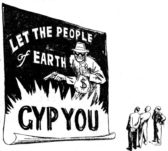 "Well, I'll tell you. When I came to see you, I was pretty sure you'd turn me down cold on importing Matter Repositors. But I had an ace up my sleeve. I hoped you would admit that the reason you've been stalling on selling Earth any Repositors is that you don't really have a practical one. I thought maybe rumors of the Repositor's powers had been vastly exaggerated. If you admitted that, I intended to publicize it to the limit. A campaign to convince Earthmen that you'd been kidding them would work, because it plays on John Q. Public's conviction that he's pretty smart, too smart to believe all this gab about a gadget he's never seen. With your denial to back me up, I could put it across. It would be a lifesaving shot in the arm for Earth business."