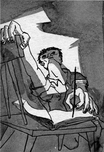 The tubercular clerk looked up from the gaudy comics sections of one of those little tabloids that have the funnies a week in advance.