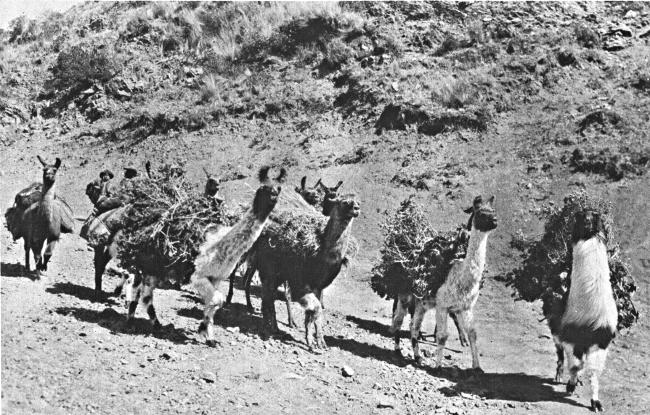 LLAMAS LADEN WITH FAGOTS COMING INTO CUZCO, PERU