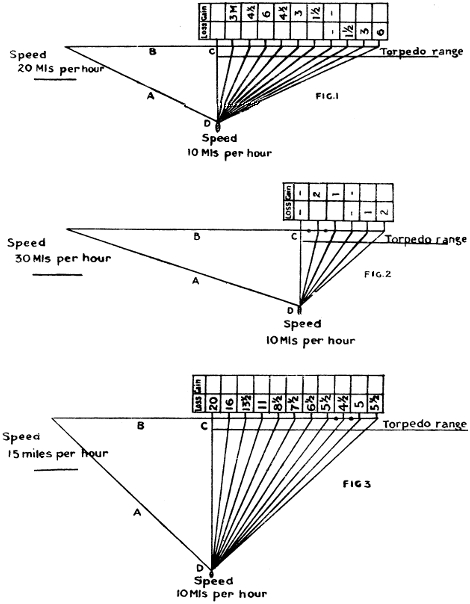 7. As it is almost impossible for a submarine, when totally submerged, to steer a perfectly straight course, the table above each chart shows the approximate average loss and gain on each mile. It must also be remembered that the submarine in actual practice need only reach the torpedo firing line.
