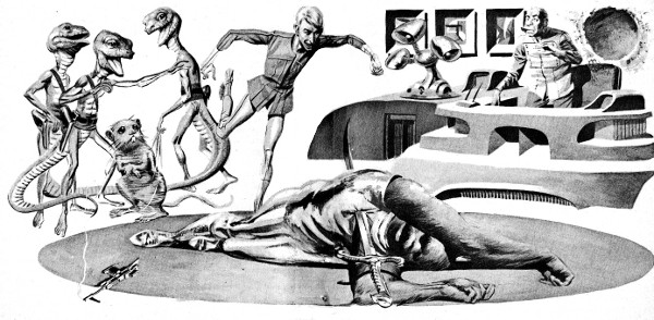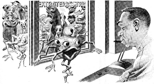 My three staff men, Auchinleck, Stebbins and Ludlow, walked shieldwise in front of me. I peered between them to size the crop up. The aliens came in every shape and form, in all colors and textures—and all of them eager for a Corrigan contract. The Galaxy is full of bizarre beings, but there's barely a species anywhere that can resist the old exhibitionist urge.