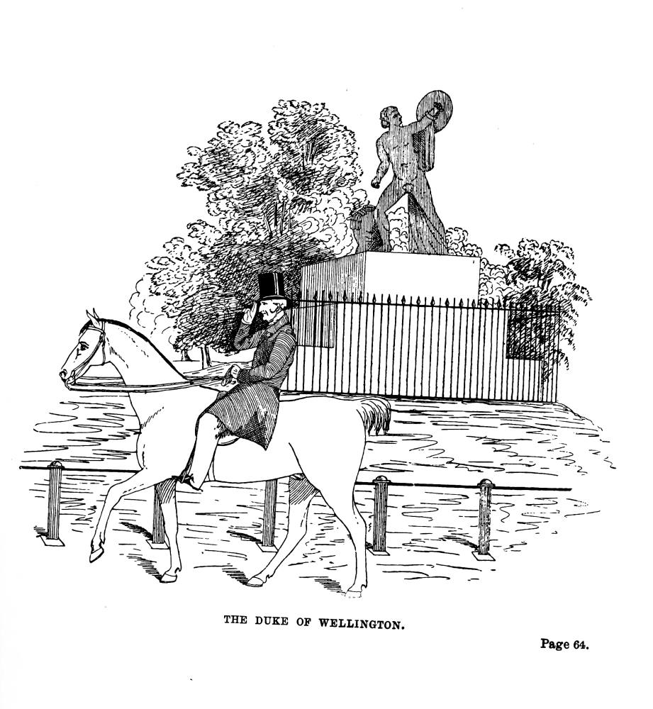 Nearly opposite Apsley House, and at the top of Constitution Hill, stands an Arch which was originally intended as a private entrance to Buckingham Palace; but it was erected on its present site about 1828, when Burton put up his screen at the entrance to Hyde Park. It is now more generally known as the Wellington Arch, from its having been surmounted by a colossal bronze equestrian statue of the great Duke, by Matthew Cotes Wyatt, in 1846. This was the outcome of a public subscription for the purpose, which is said to have amounted to £36,000. So much ridicule, however, was heaped upon it, that it was taken
