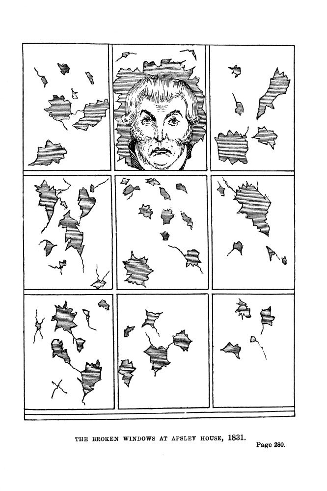 The illustration representing the Duke looking out of his smashed windows is taken from Political Sketches by H.B. (John Doyle), No. 267, June 10th, 1833, and is entitled “Taking an Airing in Hyde Park; a portrait, Framed but not YET Glazed.”