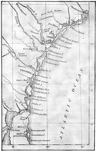 | Illustrations: General Oglethorpe, 362; Map of South Carolina and Georgia (1733), 365; Early View of Savannah, 368; Tomo-chi-chi Mico, 371; Map of the County of Savannah (Urlsperger), 373; Map of Coast Settlements before 1743, 375; Map of Coast from St. Augustine to Charlestown, S. C., with Map of Simon’s Island (Urlsperger), 379; Plan of St. Augustine (1763), 381; Map of Coast of Florida (1742), 382; Map of Harbor and Town of St. Augustine (1742), 383; Whitefield, 388. | |