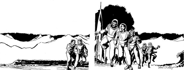 Chapman and Klein watched them dash across the pumice, making the tremendous leaps they used to read about in the Sunday supplements. The port of the rocket had opened and tiny figures were climbing down the ladder. The small figures from the bunker reached them and did a short jig of welcome. Then the figures linked arms and started back. Chapman noticed one—it was probably Donley—pat the ship affectionately before he started back.