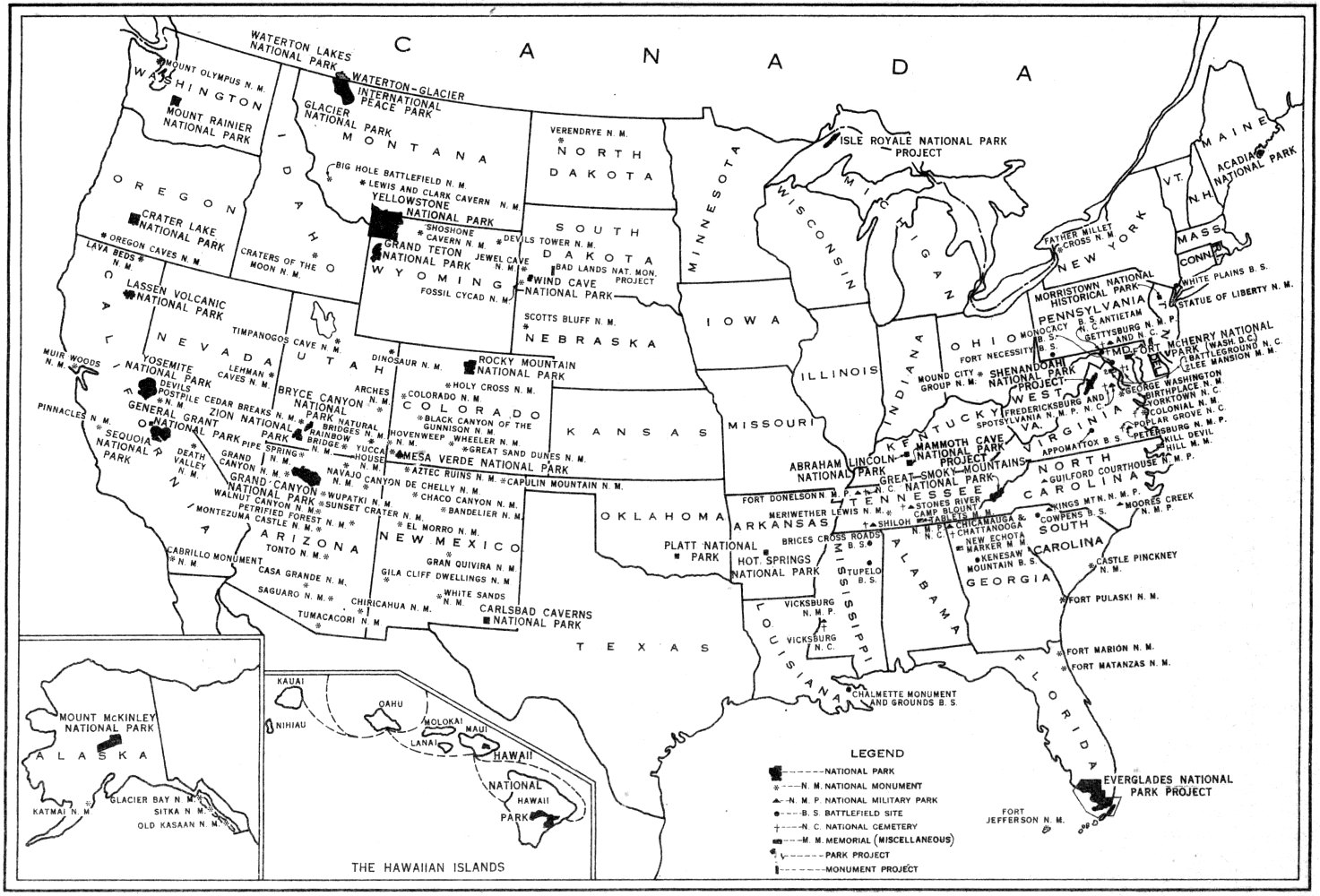 LOCATIONS OF 24 NATIONAL PARKS, 1 NATIONAL HISTORICAL PARK, 11 NATIONAL MILITARY PARKS, 68 NATIONAL MONUMENTS, 10 BATTLEFIELD SITES, 11 NATIONAL CEMETERIES, AND 4 MISCELLANEOUS MEMORIALS ADMINISTERED BY THE NATIONAL PARK SERVICE.