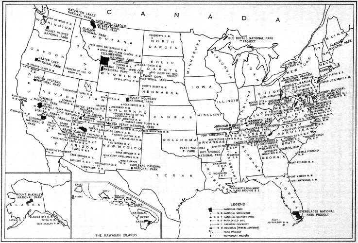 Recreational Map. Shows both Federal and State reservations with recreational opportunities throughout the United States. Brief descriptions of principal ones. Director, National Park Service, Washington, D. C. Free.