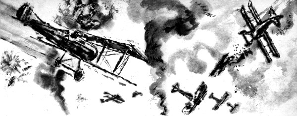 I was in the saddle of the cockpit, feeling on my face the bite of the slipstream—no, that was a later term—the prop-wash?—no, that was still later—the backlash from the screw, that was it. I was lifting to meet the Fokker triplanes in the dawn sky. Then in a moment my Vickers was chattering in answer to Spandaus, firing through the screw outfitted with iron edges to deflect bullets that did not pass to the left and right. And back through the aerial maps in the cockpit pocket at my knee.