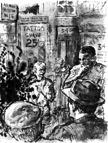 I was, I guess, stretching the ground rules a little by the way I stared at the big fellow. But he surprised me mildly. For one thing, he looked in good shape; strong, no shakes, no fevered ghosts back of the bloodshot curtain of the eyes. And, apart from that, you don't find very many Negroes on skid row, at least in our area. I don't know why.