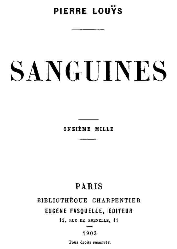 The Project Gutenberg EBook of Sanguines, by Pierre Louÿs This eBook is for the use of anyone anywhere in the United States and most other parts of the world at no cost and with almost no restrictions whatsoever. You may copy it, give it away or re-use it under the terms of the Project Gutenberg License included with this eBook or online at www.gutenberg.org. If you are not located in the United States, you'll have to check the laws of the country where you are located before using this ebook. Title: Sanguines Author: Pierre Louÿs Release Date: April 10, 2016 [EBook #51725] Language: French Character set encoding: UTF-8 *** START OF THIS PROJECT GUTENBERG EBOOK SANGUINES *** Produced by Clarity, Pierre Lacaze and the Online Distributed Proofreading Team at http://www.pgdp.net (This file was produced from images generously made available by The Internet Archive/Canadian Libraries)