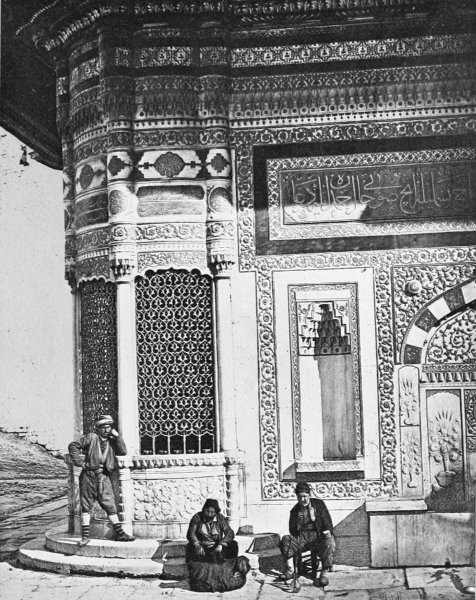 In among the Turkish dwelling-houses European palaces rise suddenly up, spires overtop the minarets, and cupolas crown the garden-terraces, with battlemented walls behind them; roofs of Chinese kiosks appear above the façade of a theatre; barred and grated harems face rows of glazed windows; side by side with open balconies and terraces are found Moorish buildings with recessed windows and38 small forbidding doorways. Shrines to the Madonna are set up beneath Arabian archways; tombs stand in the courtyards; towers arise amid the hovels; mosques, synagogues, Greek, Catholic, Armenian churches, crowd one upon the other, as though each were striving for the mastery, and, from every spot unoccupied by buildings, cypress and pine, fig and plane trees stretch forth their branches and tower above the surrounding roofs.