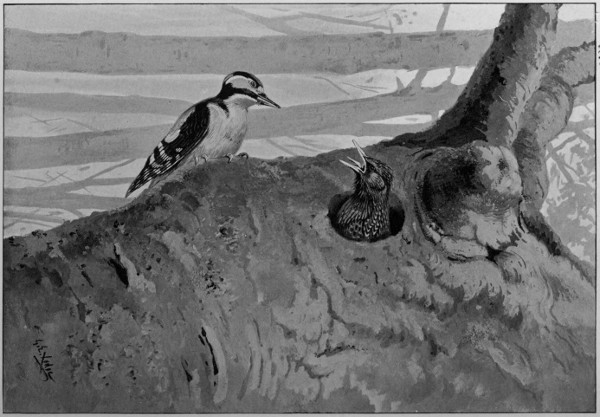 “Now I have had a fine view of the feeding, having moved into a better position. The parent bird clung to the nest, and one of the chicks, thrusting out its head from the aperture, opened its mouth, so that it looked like a little round funnel. Into this the parent bird thrust not only her bill, but the upper part of her head as well, and the chick’s mouth closing upon it, there instantly began, on the part of both, those motions which accompany the process of regurgitation, as it may be witnessed with pigeons, and as I have witnessed it with nightjars. These becoming more and more violent, the parent bird was, at last, drawn by the chick, who kept pulling 255 back upon her, into the nest—that, at least, was the appearance presented. For some moments only the posterior part of the dam’s body could be seen projecting through the aperture, and this continued to work violently, in the manner indicated. Then she disappeared altogether. A few minutes afterwards, another and much more lengthy visit is paid, by one of the old birds, to the nest, but, this time, though a young one looks out with open mouth, no feeding takes place.