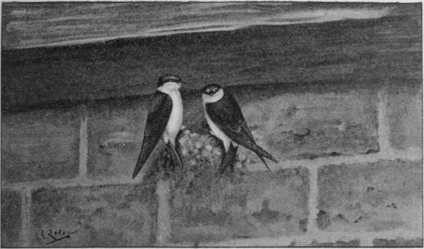“That there is some interest taken by the martins of a neighbourhood—or, at least, of any little colony—in the nests built by their fellows, seems clear, and I have recorded, both the friendly entries of one bird into two nests, each of which was occupied by another, and the struggles of two, to enter one, where, also, the partner bird, either of one or the other, was sitting. All these facts together seem best explained by supposing that the female house-martin is something of a light-o’-love, and that when she builds her nest, more than one male holds himself entitled to claim both it and her, as his own. If, for some reasons, we feel unable to adopt this view, we may fall back upon that of a social or communistic feeling, as yet imperfectly developed, and wavering, sometimes, between friendliness and hostility. Be it as it may, the facts which I have noted appear to me to be of interest. In regard to the last-mentioned one—the interest, namely, manifested by several birds, in nests not their own—White of Selborne says: ‘The young of this species do not quit their abodes all together; but the more forward birds get abroad some days before the rest. These, approaching the eaves of buildings, and playing about before them, make people think that several old ones attend one nest.’ How does this apply here? ‘Nohow,’ I reply (with Tweedledee), for no young birds could possibly have left the nests, at this date (June 5). I doubt, indeed, whether any eggs had been hatched. White, living in a southern county, says elsewhere (Letter 252 LV.): ‘About the middle of May, if the weather be fine, the martin begins to think in earnest of providing a mansion for its family.’ This is my experience too, and in East Anglia, at any rate, where May is generally like a bad March, and often colder, I am sure he never thinks about it sooner. Neither in Dorsetshire, too, when I was last there, did any martins begin building, in a village where they build all down the street, before about the middle of May, as White says, and when I inquired for them, a week or ten days sooner, the cottage people, who must know their habits in this respect, told me it was too early for them yet. Elsewhere, ’tis true, we read that the martin ‘sets about building very soon after its return, which may be about the middle of April,’ though I never remember them here before May. This is not my experience, nor was it White’s, who says—and, I believe, with great correctness—‘For some time after they appear, the hirundines in general pay no attention to the business of nidification, but play and sport about, either to recruit from the fatigue of their journey, or,’ &c. &c. (Letter LV.) (the rest of the sentence is historically interesting). However, let some young martins, in some places, be as precocious as they like, this I know, that none were abroad in Icklingham, in the year 1901, upon the 5th of June. The several birds, therefore, that attended one nest in the way I have described, were old, and not young, birds, and I connect their conduct with those other cases I have mentioned, which point towards a socialistic tendency in this species.