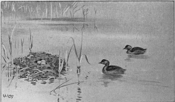 One evening in June 1901—the 6th, to be precise—I was walking near Tuddenham, where a big lane crosses a little stream by a rustic bridge, and stopped to lean against the palings on one side. Looking along the water, I saw, but hardly noticed, what looked like a snag or stump, round which some weeds and débris had accumulated. All at once, my eye caught something move on this, and, turning the glasses upon it, I at once saw that a dabchick was sitting on its nest. I watched it, for a little, and as it had built within full view of the roadside, so it was evident that it was not in the smallest degree alarmed by my presence, though, under other circumstances, it would certainly have stolen away before I was within the distance. This was about 7.15, and at 7.30 I saw another dabchick—the 297 male, as I will assume, and which, I think, is probable—swimming up to the nest. It brought some weeds in its bill, which it gave to the sitting bird, who took and laid them on the nest; and now the male commenced diving, in a quick, active, brisk little way, each time, upon coming up, bringing a little more weed to the nest, which he sometimes placed himself, sometimes gave to the female. Several times he passed right under the nest, from side to side. I now made a slight détour, and creeping up behind a hedge, found, when I raised my head, that both the birds had disappeared. Yet I was only a few paces nearer than the roadway, which shows how much habit had to do with making the birds feel secure. Walking, now, along the bank of the stream, I examined the nest more closely. It was built, I found, on the but just emerging end of a water-logged branch, the butt of which rested on the bottom. No eggs were visible, but I could see, very well, where they had been most efficiently covered over, according to the bird’s usual, but by no means invariable, habit. Upon my going back to the roadway, and standing where I had been before, one of the birds almost immediately reappeared, and swimming boldly up to the nest, leapt on to it as does the great crested grebe, but in a less lithe, and more dumpy manner. Then, still standing, it removed, with its bill, the weeds lately placed there, putting a bit here and a bit there, with a quick side-to-side motion of the head, and then sank down amongst them, evidently on the eggs. I left at 8.15. There had been no change on the nest, but I may have missed this, by 298 alarming the birds, nor can I be quite sure whether it was the same bird that went back to it. The nest of these dabchicks seemed to me to be a larger structure, in proportion to their size, than those of the crested grebes which I had watched last year. It rose, I thought, higher above the water, and was less flat, having more a gourd or cocoa-nut shape. Towards the summit it narrowed, so that the bird sat upon a round, blunt pinnacle.