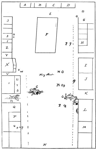 (1.) The fort on the bluff opposite the town "was burnt down in October, 1766", says Pittman (p. 43), who visited Kaskaskia about that time, or soon after, and whose book was published in London in 1770. He gives a description and detailed drawing of the town, the river, and site of the old fort. "It [the old fort] was", he says, "an oblongular quadrangle, 290 by 251 feet; it was built of very thick squared timber", etc.,—using in every instance the past tense. "An officer and 20 soldiers are quartered in the village." The evidence that the old fort was ever rebuilt is wanting.