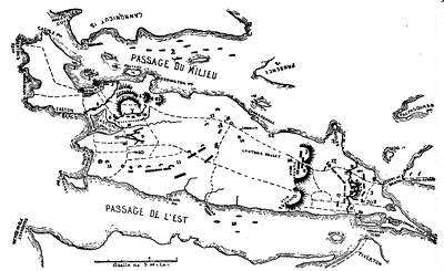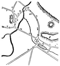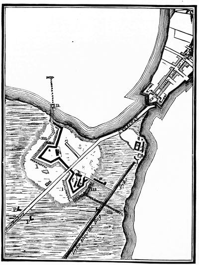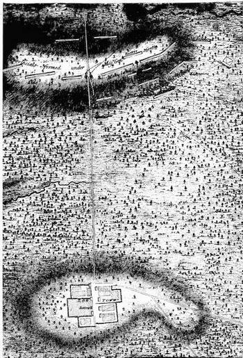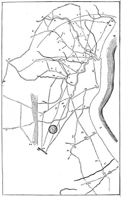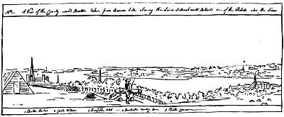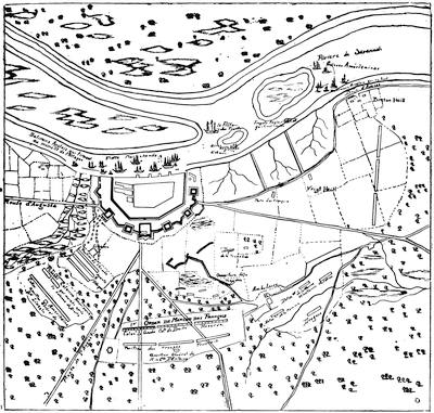 (2.) No incident appears in the contemporary narratives that Clark occupied, or even visited, the site of the old fort; and there are many allusions to his occupying quarters in the town. On one occasion, expecting an attack from the enemy, he resolved to burn the houses around the fort. "I was necessitated", he says, "to set fire to some of the houses in town, to clear them out of the way." The people came to him in distress, fearing he would burn up their town. He took an occasion for doing this when there was snow on the roofs, and only such houses were burned as were set on fire (Campaign, p. 59). The site of the old fort was 500 yards from the river, and the river was 150 yards wide. A fire there would not have endangered the town; and Pittman's plan shows no houses on the eastern bank, around the old fort.