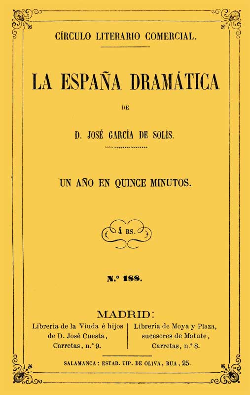 Esta obra es propiedad de DON JOSÉ GARCÍA DE SOLÍS que perseguirá ante la ley al que sin su permiso la reimprima, varie el título ó represente en algun teatro del reino ó en alguna sociedad de las formadas por acciones, suscripciones ó cualquiera otra contribucion pecuniaria, sea cual fuere su denominacion, con arreglo á lo prevenido en las Reales órdenes de 5 de Mayo de 1837, 18 de Abril de 1839, 4 de Marzo de 1844 y Ley sobre la propiedad literaria de 10 de Junio de 1847, relativas á la propiedad de obras dramáticas.