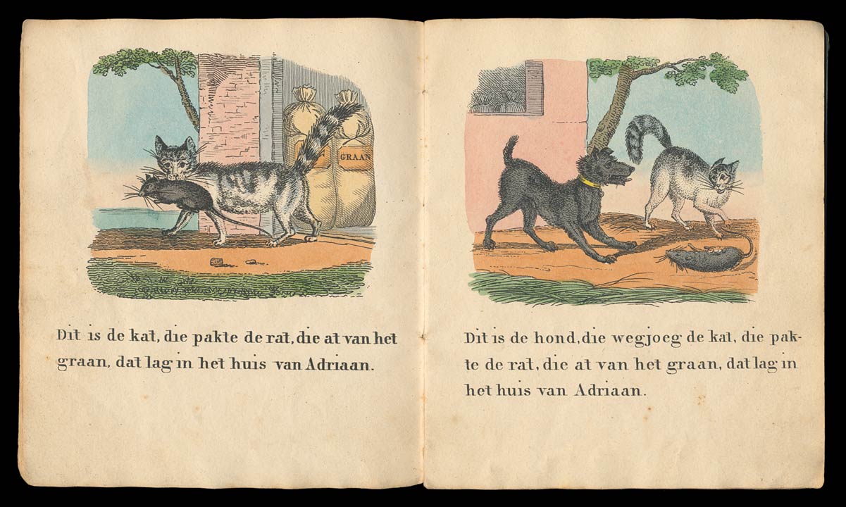 Dit is de vos die het kippenhok vond, en wegstal den haan, die in d’ochtendstond kraait wakker de dochter van Hillegond, die melkte de koe van zeshonderd pond, die omhoog smeet den hond, die wegjoeg de kat, die pakte de rat, die at van het graan, dat lag in het huis van Adriaan.