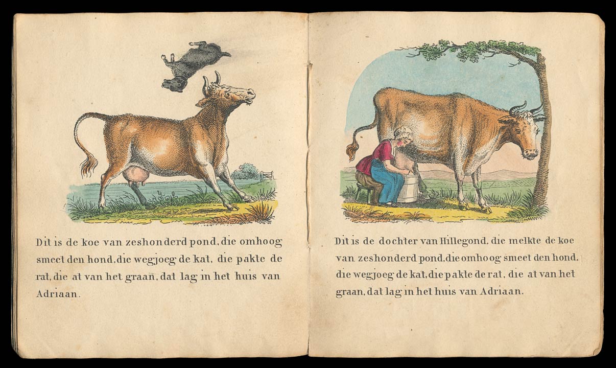 Dit is de koe van zeshonderd pond, die omhoog smeet den hond, die wegjoeg de kat, die pakte de rat, die at van het graan, dat lag in het huis van Adriaan.