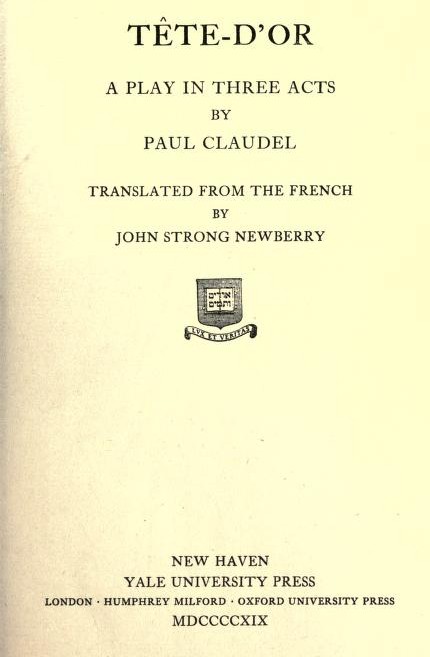 The Project Gutenberg EBook of Tête-D'or, by Paul Claudel This eBook is for the use of anyone anywhere in the United States and most other parts of the world at no cost and with almost no restrictions whatsoever. You may copy it, give it away or re-use it under the terms of the Project Gutenberg License included with this eBook or online at www.gutenberg.org. If you are not located in the United States, you'll have to check the laws of the country where you are located before using this ebook. Title: Tête-D'or Author: Paul Claudel Translator: John Strong Newberry Release Date: May 16, 2016 [EBook #52088] Language: English Character set encoding: UTF-8 *** START OF THIS PROJECT GUTENBERG EBOOK TÊTE-D'OR *** Produced by Winston Smith. Images provided by the Internet Archive.