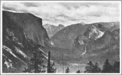 The Yosemite has been gradually disclosing its features to us since early morning. The first impression that we experience as we leave the town of Merced is one of steady ascent into a narrow gorge, through which a busy, turbulent stream—the Merced River—pursues its course. The train labors sturdily up until it reaches El Portal, where there is a pause at the hotel for lunch. Then the trip is resumed in auto buses that take us on up through a valley, winding and narrowing into a notch that seems at times as if it would end in sheer walls of rock. But, in the course of an hour or more the way broadens, and we find wider stretches, wooded with tall pines and stately sequoias.
